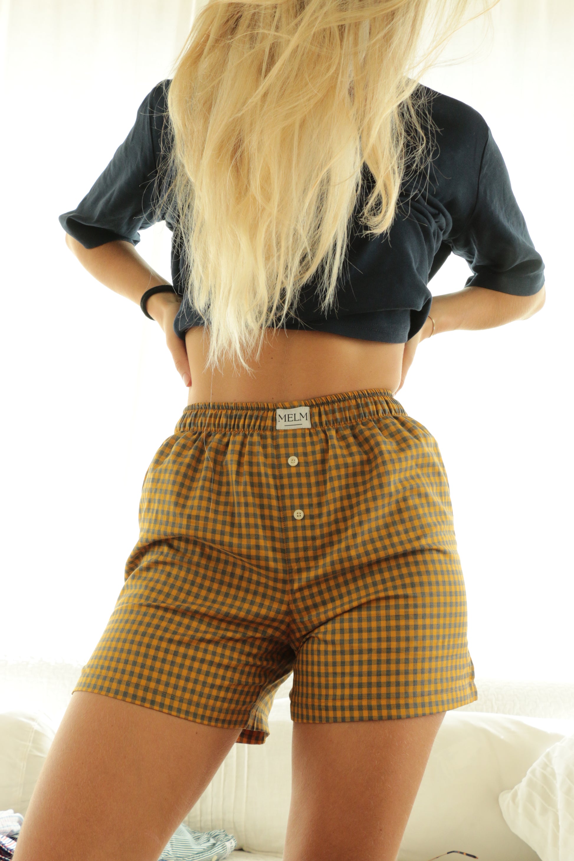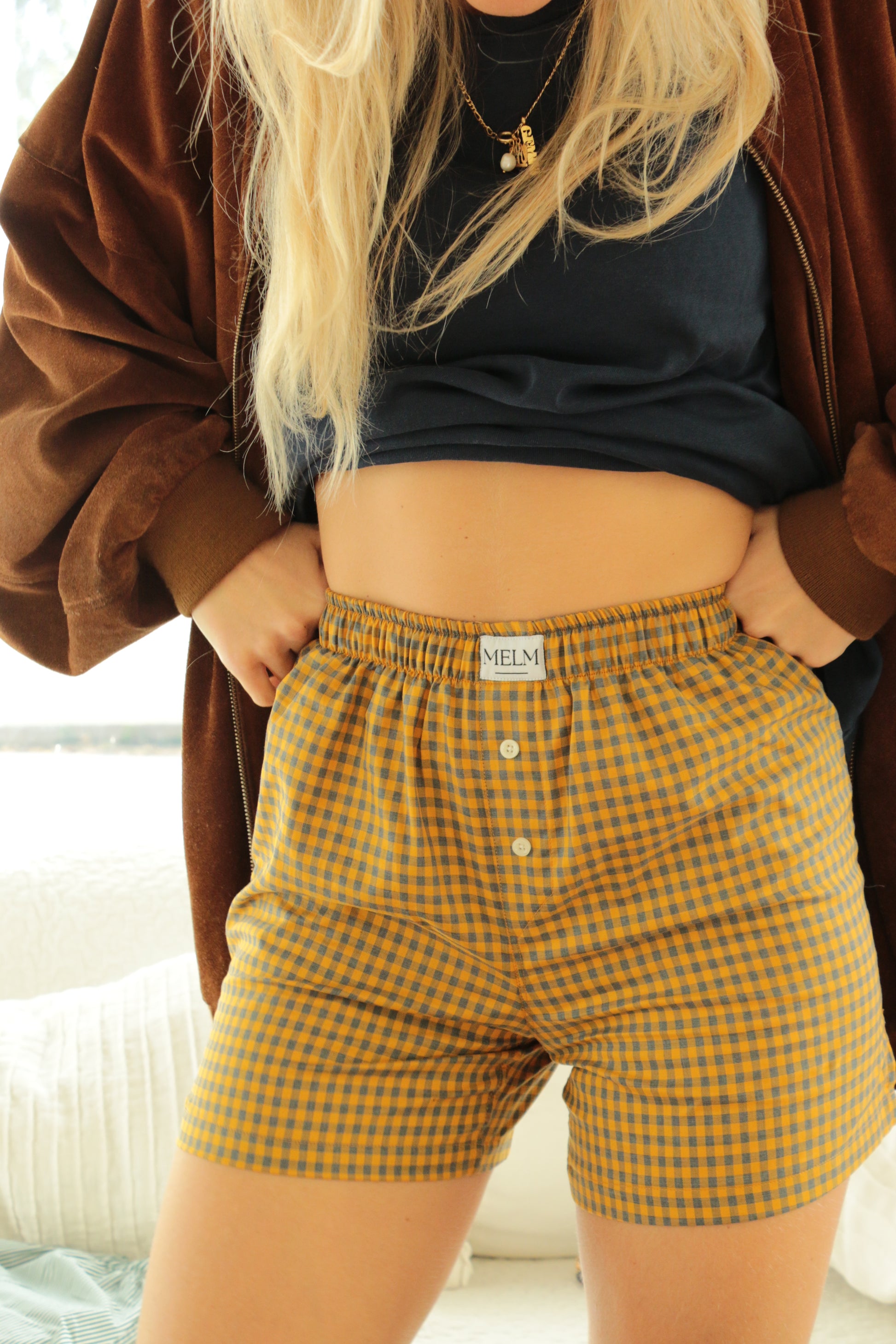 LO STAGIONALE è il nostro boxer a quadri gialli e grigi: morbido, accogliente, e perfetto per scaldarti quando fuori fa freddo.
